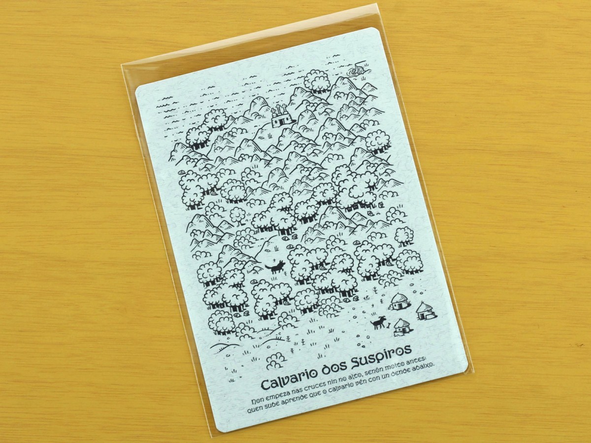 Las postales van protegidas en funda transparente, selladas con una pegatina impresa que indica el nombre de la escena y el número de la edición limitada (por ejemplo, “Penedo da Espiral – 12 de 100”).